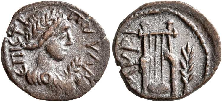 | BMC 33 | Myrina, Aeolis, AE17, semi-autonomous issue. AD 100-200. 2.48 g. AΡ KOΡNHΛIOY, draped bust of Apollo right, laurel branch before neck. / MYΡINAIΩN, lyre, palm branch to left. BMC 33-34; SNG Cop 228-229. | Text | ![]() |