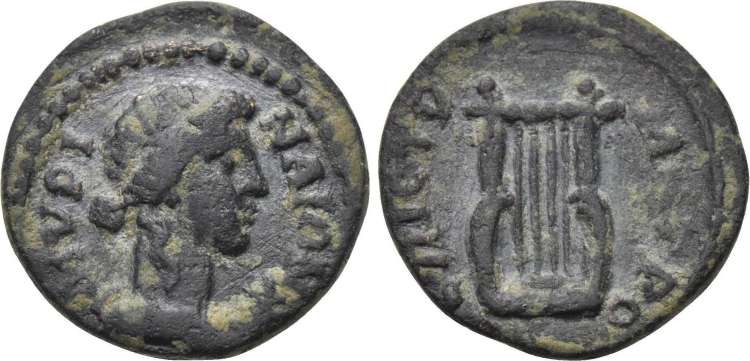 | SNG Cop 234 | Myrina, Aeolis, AE15, semi-autonomous issue, AD 161-165. 2.65 g. Magistrate M. Oul. Aristophanes. MYΡINAIΩN, laureate, draped bust of Apollo right, laurel branch before neck. / EΠI M OYΛ AΡICTOΦANOYC (clockwise from top right), lyre. SNG Cop 234; Imhoof GRM 89 in RSN 19; Lindgren I 410. | Text | ![]() |