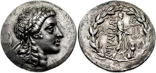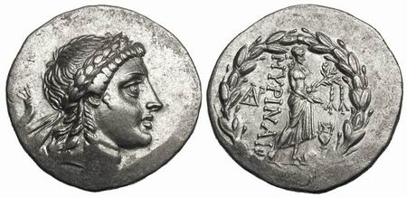 | Sacks 39 | Myrina, Aeolis AR Tetradrachm. After 165 BC. Laureate head of Apollo right, hair in three loose curls / MYΡINAIΩN, Apollo Grynios holding patera and filleted branch, omphalos and amphora at foot right; ΠY monogram to left. Sacks Issue 39; BMC 13; Paris 353. | Text | ![]() |