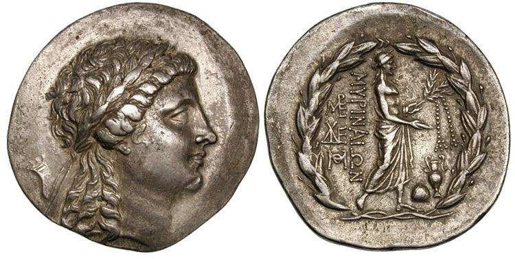 | Sacks 14 | Myrina, Aeolis AR Tetradrachm. ca 155-150 BC. Laureate head of Apollo right, hair on neck in tight spiral curls / MYΡINAIΩN, Apollo of Grynium standing right, holding phiale & filleted branch, omphalos & amphora before his feet, ΠAΩ monogram in outer left field, all within laurel wreath. | Text | ![]() |