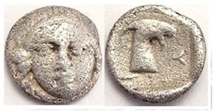 | Traite 2083 var | Myrine, Aeolis, Tritetartemorion, 0.51 gr, 7mm. Facing female head, hair in band / MYΡI, Head of goat right within incuse square. Traité II 2083 var (denomination). | Text | ![]() |