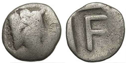 | BMC 1 | Oeniadae, Acarnania, 4th C BC, AR 14mm pentobol, 1.8 g. Bearded head of the river-god Acheloös right / Φ within an incuse square. BMC 1; Imhoof Acarnania 2-3; Traité II-4, 9 | Text | ![]() |