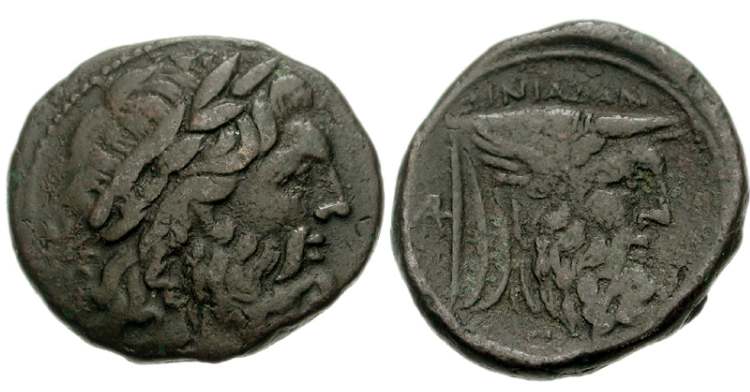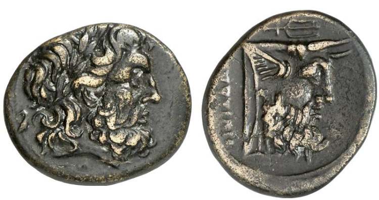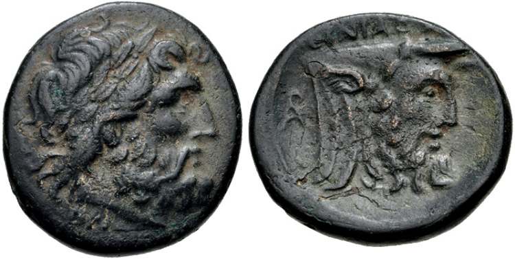 | Hoover 899 | Oiniadai, Akarnania, ca 219-211 BC. AE20mm, 7.15 g. Laureate head of Zeus right; ΠΡI below / Head of the river-god Acheloös right; AΡ monogram behind head. BCD Akarnania 351.4–7; Hoover HGC 4, 899. | Text | ![]() |