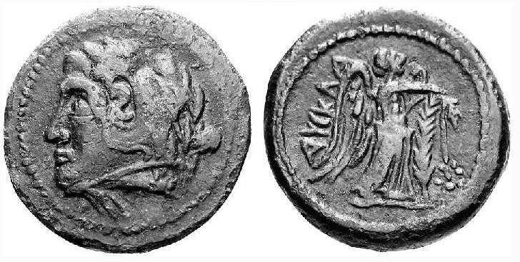 | BMC 5 | Apulia, Ausculum, AE 18mm. 3rd Century BC. Head of young Herakles left, wearing lionskin headdress, club behind neck / AYCKΛA, Nike standing right, holding wreath and palm. SNG ANS 648; Rutter HN Italy 65; SNG München 448; Righetti Coll Sale II, 58; BMC 5. | Text |  |