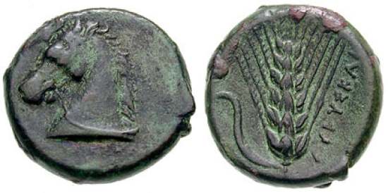 | Sear SG 571 | Ausculum, Apulia. AE Obol. ca 300-275 BC. 8.63 g. AYTYΣKΛI, horse's head left / AYTYΣKΛI right, grain ear. SNG ANS 647; BMC 1-3; Sear SG 571. | Text |  |