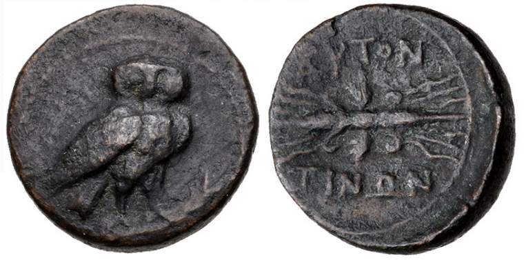 | Rutter 755 | Butuntum, Apulia. Ca 275-225 BC. AE Hemiobol. Owl standing right on branch / BYTON-TINΩN, Winged thunderbolt. SNG ANS 662-663; Rutter, HN 755. | Text | Image |