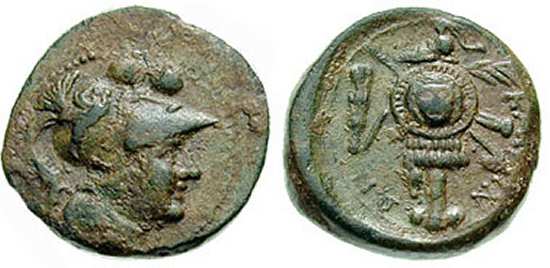 | HN Italy 764 | Caelia, Apulia, AE22 sextans, ca. 210-150 BC. 6.96 g. Helmeted head of Athena right, two dots above. / KAIΛINΩN, trophy, upright club to left. HN Italy 764; SNG ANS 670-671; SNG Cop. 632. | Text | Image |