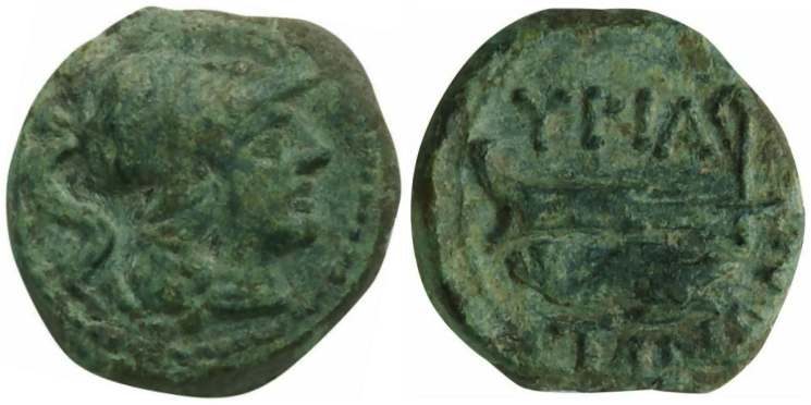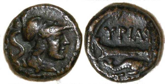 | HN Italy 666 | Apulia, Hyrium AE 13mm. Circa third century BC. Helmeted head of Athena right / YΡIAT-INΩN above and beneath rudder above a dolphin. SNG ANS 696-698; Sear GCV 584var; HN Italy 666; BMC 1. | Text Text | Image Image |