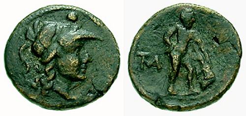 | BMC 1 | Apulia, Mateola. ca 210-150 BC. AE Sextans. Head of Athena right, in crested Corinthian helmet; two pellets above / MAT monogram right, lion sitting right, head facing, breaking a spear held in its mouth. BMC 1; SNG Cop 666. | Text | Image |