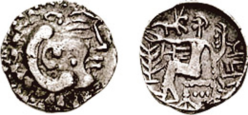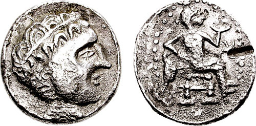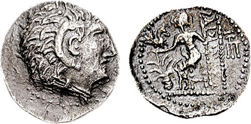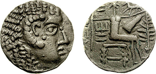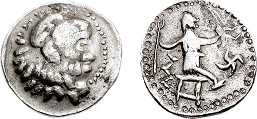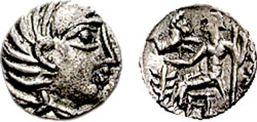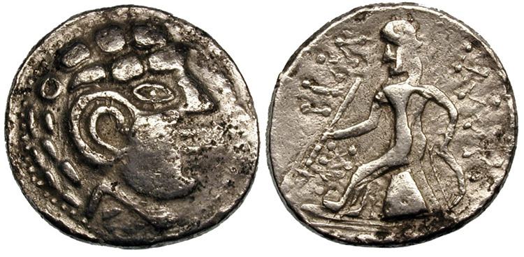 | Potts_253 | Arabia, Southeast (Macai), Abi'el AR Obol. Late 2nd century BC. Mleiha mint, imitating Alexander III of Macedon. Head of Herakles right, wearing lionskin headdress / Figure seated left, holding forepart of horse and staff; date-palm in left field.