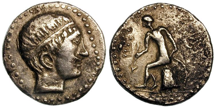 | Potts_377 | Arabia, Southeast (Macai). Abi'el. 1st century BC-1st century AD. AR Drachm (4.02 gm, 3h). Mleiha mint. Imitating Alexander III. Head of Herakles right, wearing lionskin / Figure seated left, holding horse and staff; date-palm and tri-fluked anchor in left field, "Abi'el" in blundered Aramaic in right. Potts, Supplement, Class XLVII, 377 (same dies). | Text | Image |