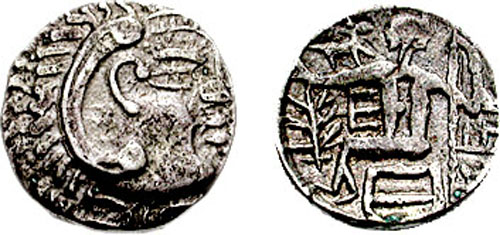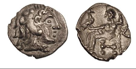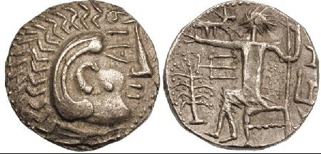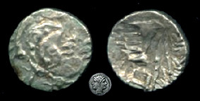 | Potts_313 | Arabia, Southeast (Macai). Abi'el. 1st century BC - 1st century AD. AR Obol (0.97 gm, 3h). Mleiha mint. Imitating Alexander III of Macedon. Head of Herakles right, wearing lionskin / Figure seated left, holding horse and staff; date-palm and tri-fluked anchor in left field, "Abi'el" in blundered Aramaic in right. Potts, Supplement, Class XLIV, 313-314. | Text | Image |