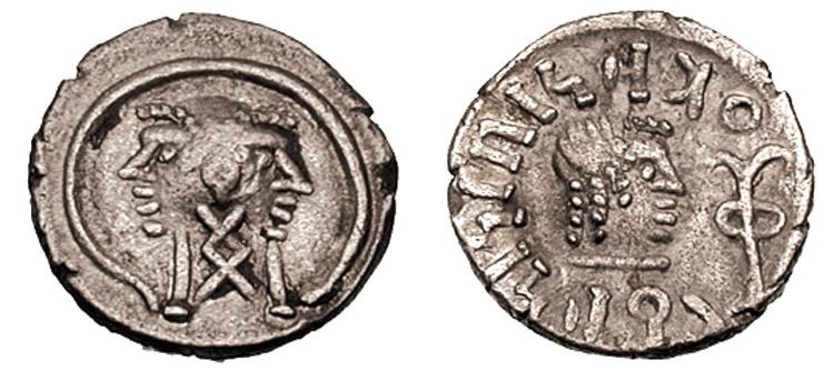 | Munro_170 | Southern Arabia, 'Mdn Byn AR Helf Unit. First century AD. Janiform head, Sabaean letter SH on neck / Head right with spiral curls, sceptre symbol before.