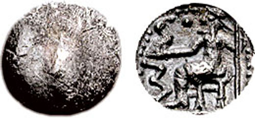 | Potts_177 | Arabia, Southeast (Macai) AR Obol. 2nd century BC. Mleiha mint, imitating Alexander III of Macedon. Blank / Figure seated left, holding eagle and staff; dot in upper field, vertical shim in left field.