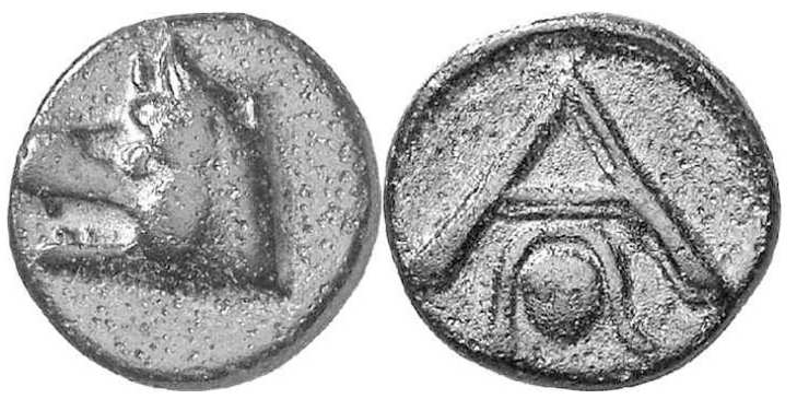 | SNG Cop 2 | Argolis - Argos. 468-421 B.C. AR Hemidrachm. Forepart of boar left / Large A in shallow square incuse, dot below. | Text | Image |