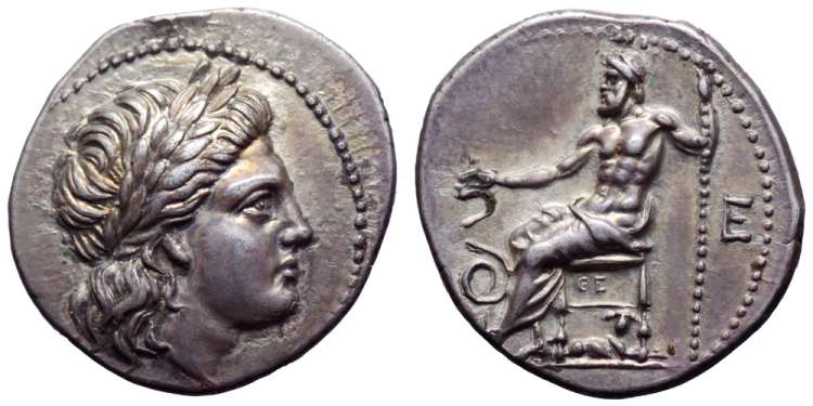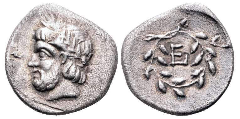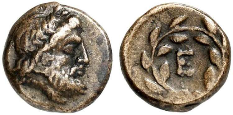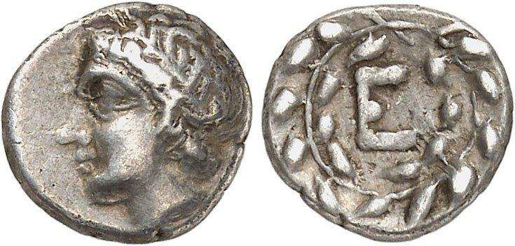 | Traité 677 | Epidauros, Argolis, AR Obol. late 4th or early 3rd cent. BC. 0.80 g. Laureate head of Apollo left / E within wreath. BCD 1223; Traité 677. | Text | Image |