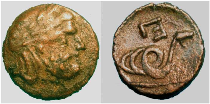 | SNG Cop 121 | Epidauros, Argolis. AE 12. Circa 350 BC. Laureate head of Asklepios right / E within laurel wreath, Π below. SNG Cop 121; Sear 2815; Hoover 740; BMC 20. | Text | Image |