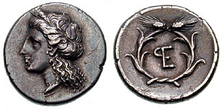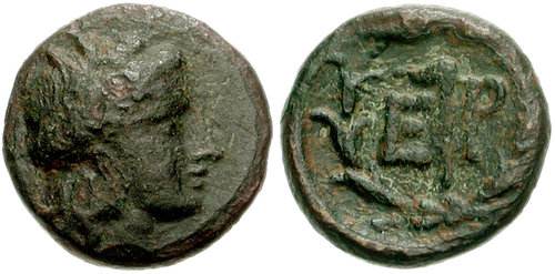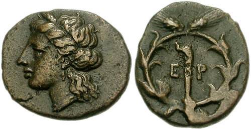 | BCD 1304 | Hermione, Argolis, ca 300-250 BC. AE Trichalkon, 3.06 g. Wreathed head of Demeter Chthonia facing slightly right / EP monogram within wreath of grain ears. Grandjean, group II, em. 7; BCD Peloponnesos 1304.1. | Text | Image |