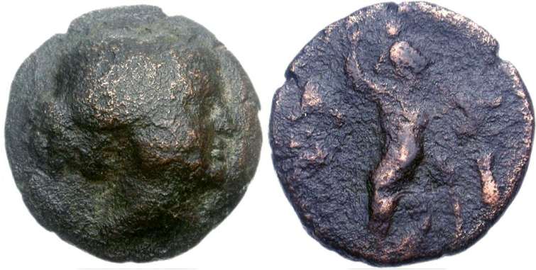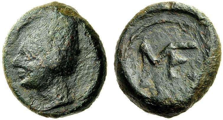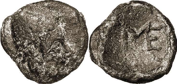 | Gill 1D | Methana, Argolis. AE, 4.69 gr. mid-4th c. BC. Head of Hephaistos left, wearing conical pileus / Large ME ligate. Gill, Coinage of Methana, 1D. | Text | Image |