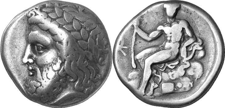 | BMC 49 | Arkadian League. AR stater, ca 363-362 BC. 24 mm, 12.19 g. Laureate head of Zeus left. / Young Pan seated left, head facing, on rock covered by his mantle, holding lagobolon in his right hand, leaning on his left arm; AΡK monogram to left, syrinx below, OΛYM in small letters at bottom of rocks. BCD (Megalopolis) 1511; BMC 49; SNG Fitz 3851. | Text | Image |