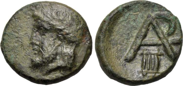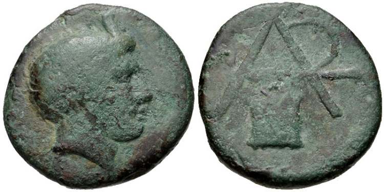 | BMC 66 | Megalopolis, Arkadia, AE19, Arkadian League issue. Trichalkon, ca 340-275 BC. Horned head of Pan right / AΡK monogram; syrinx (Pan pipes) below, N in upper left field. BMC 66; Hoover HGC 934. | Text | Image |