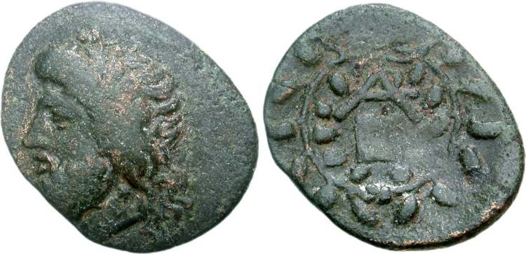 | BMC 75 | Megalopolis, Arkadian League issue, AE18. Trichalkon, ca 363-350 BC. 4.04 g. Laureate head of Zeus left / AΡK monogram, syrinx below, all within oak wreath. BMC 75; BCD Peloponnesos (Megalopolis) 1514-1515. | Text | Image |