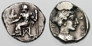 | SNG Cop 175 | Arcadian League, Arcadia, ca 477-428 BC. AR Hemidrachm 3.00 gm. Uncertain mint. Zeus Lykaios seated left, holding eagle in extended right hand, sceptre in left / [A]Ρ-K-[A]-ΔI-ON, head of deity right, hair bound and tied in knot behind head, wearing necklace, within incuse square. cf. BMC 39; SNG Cop. 175; cf. Dewing 1935. | Text | Image |