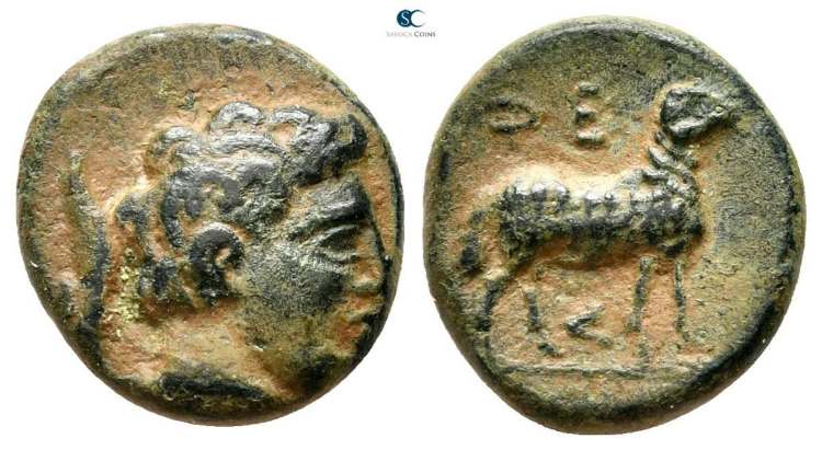 | BCD Pelop. 1611 | Pheneos, Arkadia, AE17 dichalkon, ca 360-350 BC. 3.44 g. Draped bust of Hermes right, petasos slung behind neck. / ΦENE above ram standing right, ΣI below. BCD Peloponnesos 1611; Hoover HGC 985. | Text | Image |