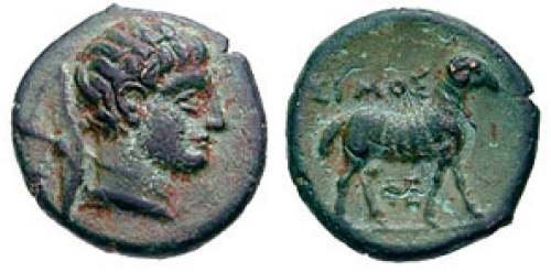 | BMC 8 | Pheneos, Arkadia, AE19 dichalkon, ca 370-340 BC. 2.8 g. Head of Hermes right, petasos slung behind neck. / ΦENEΩN above ram standing right, ΣI below. BMC 8; Traité II-3, 893. | Text | Image |
