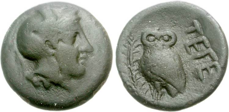 | BMC 6 | Arkadia, Tegea. ca 420-370 BC. AE 15mm. Head of Athena right, in crested Athenian helmet / TE-ΓE, owl standing left. BMC Appendix 6.