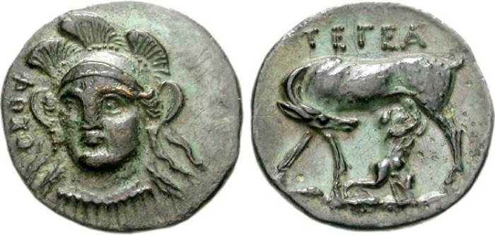 | BMC 14 | Tegea, Arkadia. AE Trichalkon. Civic issue. ca 250 BC. 3.77 g. ΘEOΦ to left of head of Athena facing slightly left, wearing triple-crested Attic helmet and necklace. / TEΓEA, the infant Telephos kneeling right, suckled by doe standing left, head right. BMC 14; BCD Peloponnesos 1735; Weber 4349. | Text | Image |