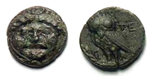 | Traité 980 | Tegea, Arkadia, AE16. ca 423-400 BC. 3.21 g. Head of gorgoneion facing. / TEΓE, Owl standing left, head facing. Traité II-3 980; Hoover HGC 1057; BCD Pelop. 1722. | Text | Image |