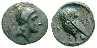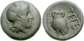 | BMC 8-9 | Tegea, Arkadia. AE dichalkon, ca 370-350 BC. 3.91 g. Helmeted head of Athena right. / TEΓE downwards to right of owl standing left on tall olive branch, head facing. BMC (Appendix) 8-9; BCD Peloponnesos 1728s. | Text | Image |