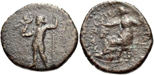 | SNG Cop 314 | Tegea, Arkadia. AE Hexachalkon. Civic issue. ca 50-25 BC. 6.36 g. Struck under Macedonian rule. AΛEOΣ, head of Aleos right, hair bound in a taenia. / TEΓEATAN, Kepheus standing right, holding shield and spear, receiving lock of Medusa’s hair from Athena, standing left, holding spear; Sterope standing right between them, holding vessel. TA monogram in upper centre. SNG Cop 314; BCD Peloponnesos 1749; Pausanias 3b. | Text | Image |