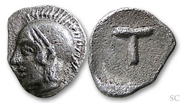 | Traité 976 | Tegea, Arcadia, AR Tetartemorion. 0,24gr. Helmeted head of Athena left / Letter T within shallow incuse square. Traite 976. | Text | Image |