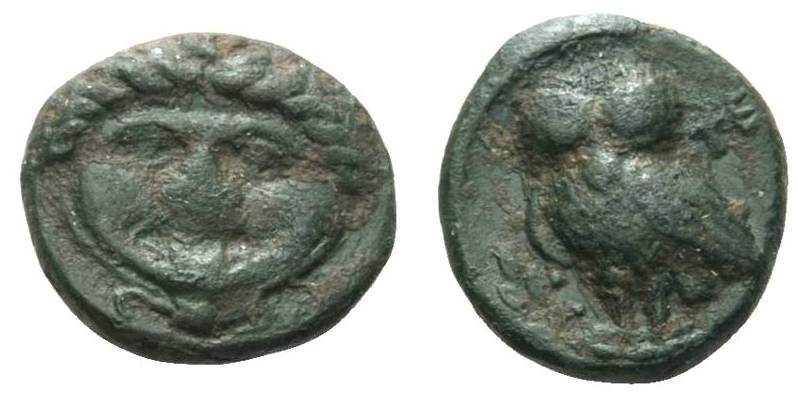 | SNG Cop 292 | Tegea, Arkadia. 420-390 BC. AE 14 mm. Gorgoneion. / TE, Owl standing left, head facing, olive branch at lower left.