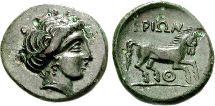 | BCD Pelop. 1759 | Thelpusa, Arcadia. Circa 370-350 BC. AE Dichalkon, 5.76 g. Head of Demeter Erinys right / EΡIΩN, The horse Areion prancing right; Θ below. BCD Peloponnesos 1759; Imhoof Monnaies Grecques 282; Traité III. 937. | Text | Image |