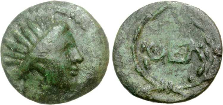 | BCD Pelop. 1761 | Thelpusa, Arcadia. AE Dichalkon, ca 50-25 BC. 3.52 g. Radiate head of Apollo or Helios right /QEL within wreath. BCD Peloponnesos 1761; Mionnet II, 76. | Text | Image |