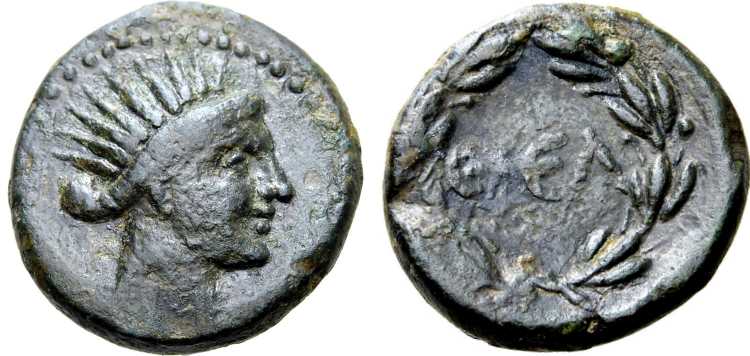 | BMC 2 | Thelpusa, Arkadia, AE17. 50-25 BC. 5.12 g. Radiate head of Apollo right. / ΘEΛ within laurel wreath. BMC 2; SNG Cop 320; Traité III, 939. | Text | Image |