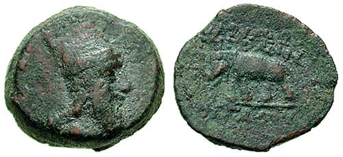 | CAA 150 | Kings Of Armenia. Tigranes IV. First reign, 10-5 BC. AE Half Chalkous 17mm, 4.41 g. Artaxata mint. Diademed, draped, and bearded bust right, wearing tiara / Elephant standing left. M&D 145; Kovacs, Armenia II 8 (as Tigranes V); CAA 150. | Text | Image |