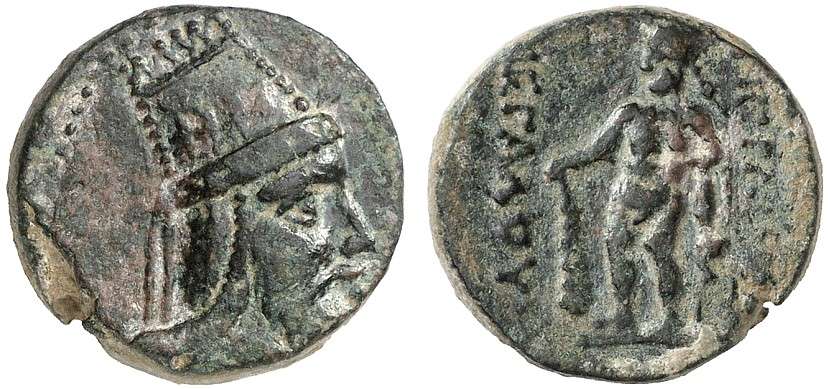 | Depeyrot 142 | Tigranes IV AE chalkus, 10-5 BC. 6.55 g. Artaxata mint. Bearded head right, wearing tiara. / BAΣIΛEΩΣ TIΓΡANOY MEΓAΛOY, Herakles standing left, resting on club. Depeyrot 142; Nercessian 157ff.; Alram 221. | Text | Image |
