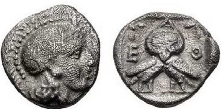 | BMC 174 | Athens, Attica, AR diobol. ca. 393-300 BC. 10 mm, 1.23 g. Helmeted head of Athena right. / E-Θ across fields, double-bodied owl standing facing. A above, olive sprig in upper corners. BMC 174; SNG Cop 72-73, SNG München 110 ff. | Text | ![]() |