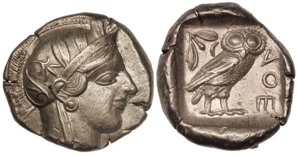 | Sear SG 2520 | Athens, Attica AR Tetradrachm. 465-460 BC. Head of Athena right in crested helmet / Owl standing right, head facing, olive spring and crescent to left. | Text | ![]() |