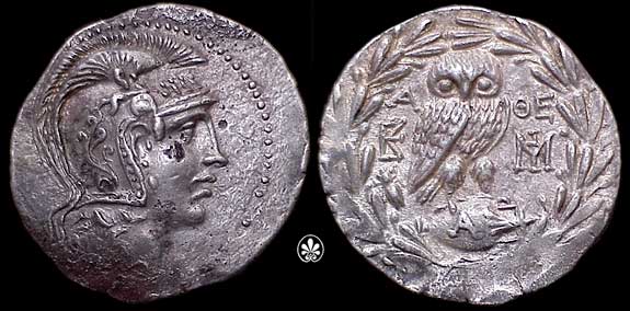 | Thompson 718b | Athens, Attica, New Style Tetradrachm, ca. 110-109 BC. magistrates Zoilos, Euandros, and Sokrat-. Helmeted head of Athena right wearing triple-crested helmet / A-ΘE ZΩI-ΛOΣ EYAN-ΔΡOΣ ΣΩK-ΡA-T, owl standing right on overturned amphora, bee in right field, K on amphora, ΣΦ below, all within olive wreath. Thompson Athens 718b; Svoronos Athens pl. 60, 26. | Text | ![]() |