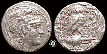 | Thompson 764b | Athens AR New Style Tetradrachm. ca 105 BC. Helmeted head of Athena right / Owl standing right, head facing, on overturned amphora. | Text | ![]() |