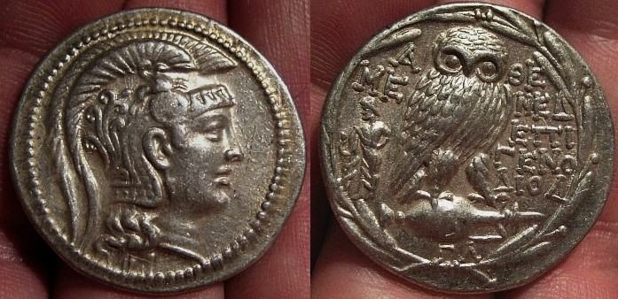 | Thompson 432 | Athens, Attica. 127/6 BC. AR New Style Tetradrachm (16.36 gm). Helmeted head of Athena right / ΛY-ΣAN ΓΛAY-KOΣ NIKΩN, Owl standing right on amphora; cicada to left. | Text | ![]() |