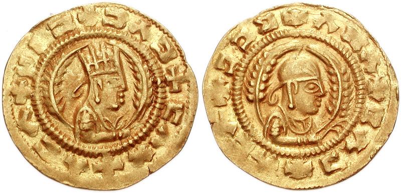 | BMC 304 | Axum, Ebana, ca. 450-500, AV tremissis. Crowned & draped bust right, holding branch & framed by grain ears /draped bust right, in headcloth. Munro-Hay Type 71; BMC Aksum 304.