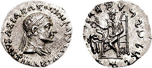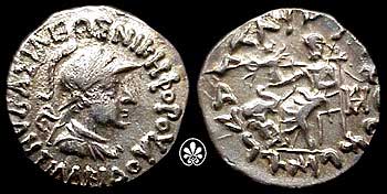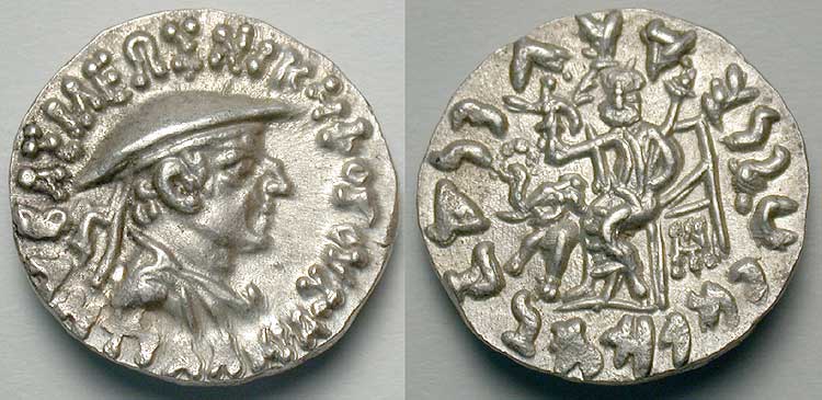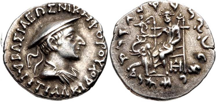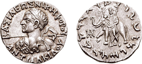 | Bop 13c | Indo-Greek Kings. Antialkidas. Ca.115-95 BC. AR drachm. BAΣIΛEΩΣ NIKHΦOΡOY ANTIAΛKIΔOY, diademed and draped bust right, wearing kausia; below / Zeus enthroned left, holding Nike in outstretched right hand, sceptre in left; forepart of elephant to left. | Text | Image |