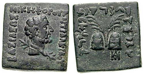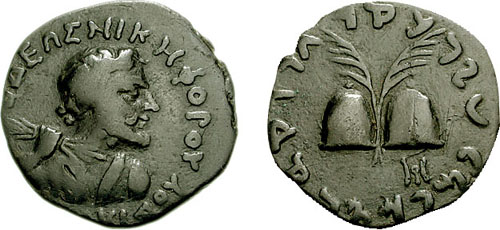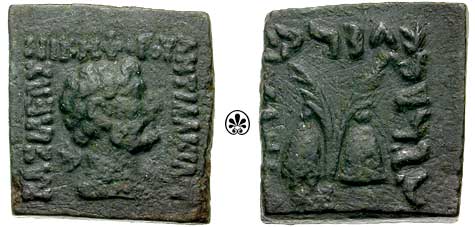 | Bop 14Av | Baktria, Antialkidas AE 24mm. ca 115-95 BC. Indian standard, Pushkalavati mint. BAΣIΛEΩΣ NIKHΦOΡOY ANTIAΛKIΔOY, Draped bust of Zeus right, holding thunderbolt in raised right hand about to hurl it. / Two palm branches between caps of the Dioskuri; monogram left below. SNG ANS 1104; MIG I 281a. | Text | Image |