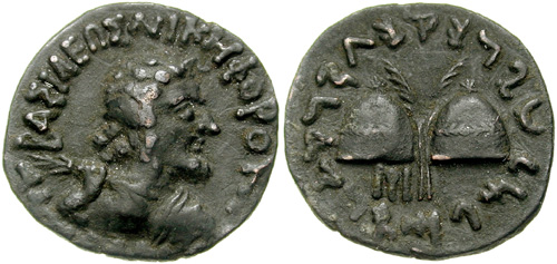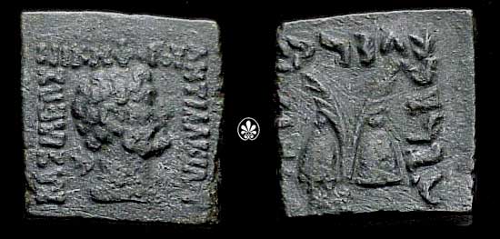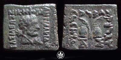 | Bop 15A | Baktria, Antialkidas. Circa 115-95 BC. AE Unit, 6.52 g. BAΣIΛEΩΣ NIKHΦOΡOY ANTIAΛKIΔOY, Bust of Zeus Keraunouchos right / Pilei and palms of the Dioskuri; monogram to lower right. Bopearachchi Série 15A; SNG ANS 1107-1109. | Text | Image |